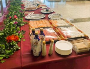 会場に到着後、長テーブルにずらりとお料理をセッティング。